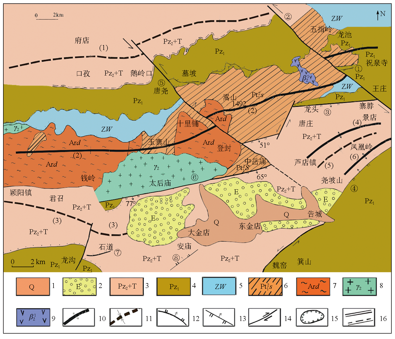 ①助泉寺断裂; ②五指岭断裂; ③上寺沟断裂; ④龙头—寨脖断裂; ⑤尧坡山断裂; ⑥唐窑—中岳庙断裂; ⑦登封大断裂; ⑧安庙断裂