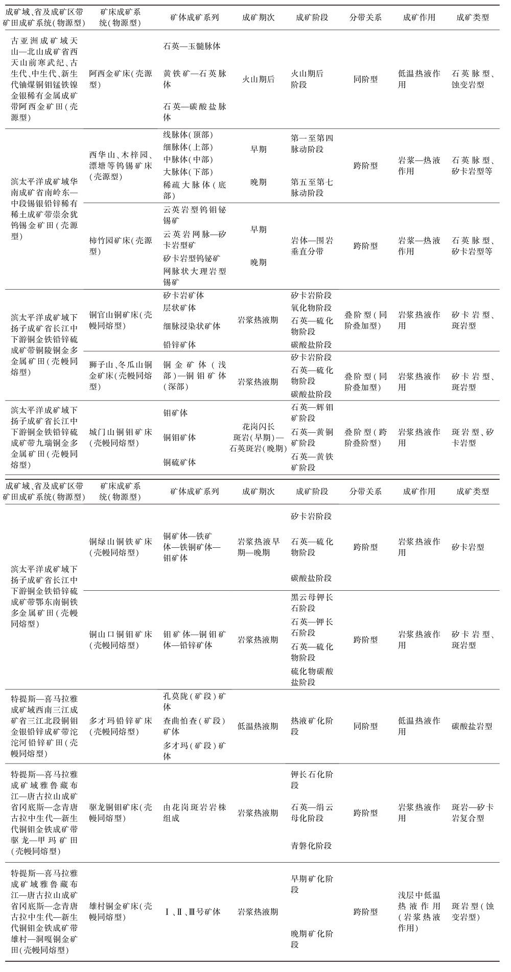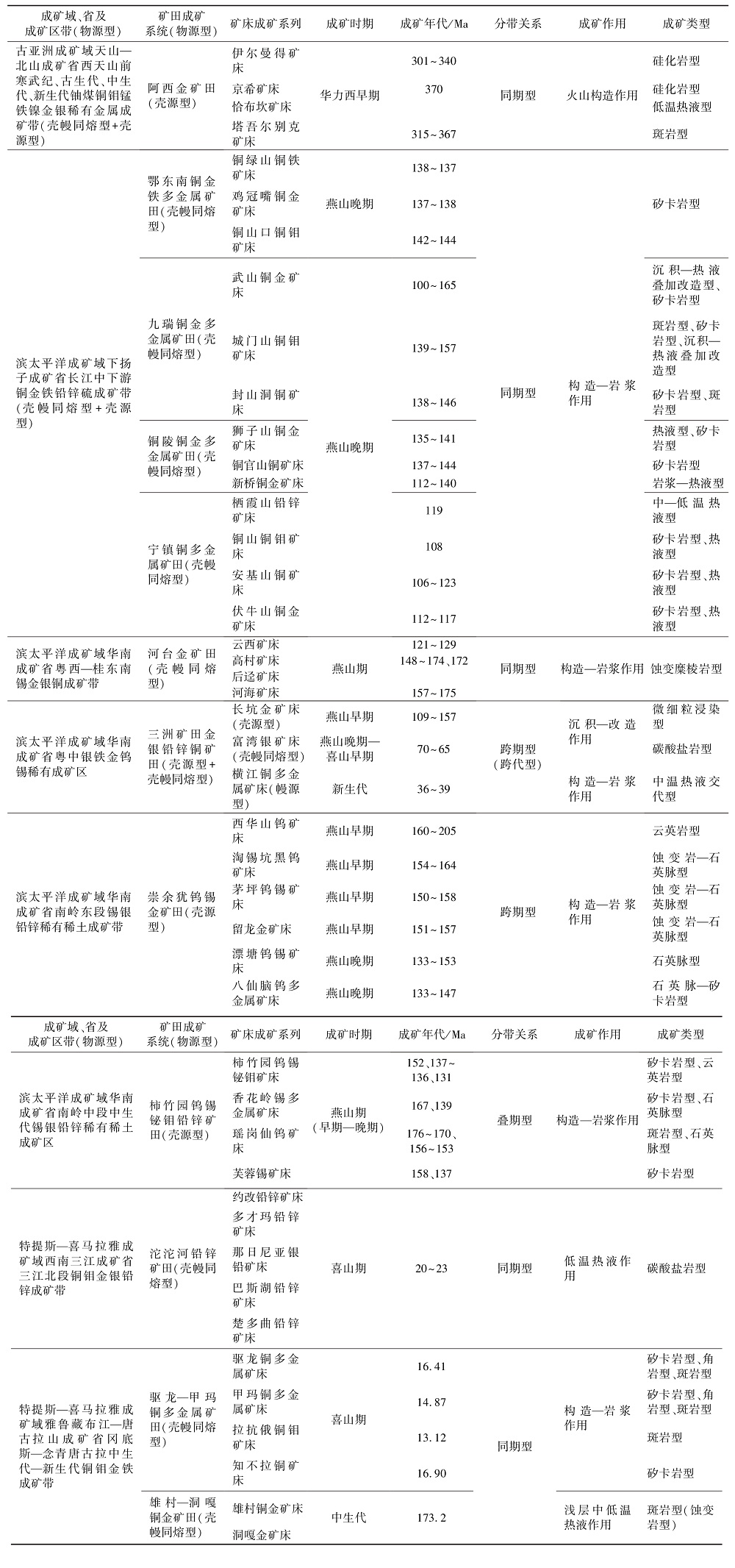 | 成矿域(物源型) | 成矿年代 | 成矿作用 | 成矿省(物源型) | 成矿年代 | 成矿富集元素组合 | 成矿区带系列 | | 古亚洲成矿域(幔源型+多源型) | 元古宙—古生代+中生代 | 古亚洲洋陆缘增生+洋陆俯冲作用 | 吉—黑成矿省(幔源型+壳源型+壳幔同熔型) | 元古宙+古生代+中生代(燕山期) | Cu、Ag、Pb、Zn、Au、Ni、Co、Cr、Fe2O3 | 完达山中生代有色—贵金属成矿区、太平岭—老鸭岭古生代—中生代金铜镍铅锌银铁成矿区、佳木斯—兴凯太古宙—元古宙—古生代—中生代铁多金属非金属成矿区、小兴安岭—张广才岭铁太古宙—古生代—中生代金铜镍银铅锌成矿带、松辽盆地新生代油气成矿区 | | 大兴安岭成矿省(幔源型+壳源型+壳幔同熔型) | 元古宙+古生代+中生代(华力西期+燕山期) | Cu、Mo、Ag、Pb、Zn、Au、Hg、Sb、W、Sn、Cr、Fe2O3 | 额尔古纳中生代铜钼铅锌银金成矿带、大兴安岭北段古生代—中生代铁锡铜铅锌银金成矿带、大兴安岭南段古生代—中生代金铁锡铜铅锌银铍铌钽成矿带、二连—东乌旗古生代—中生代—新生代铜铁铬铅锌银成矿带、锡林浩特—索伦山元古宙—古生代—中生代铜铁铬金钨锗萤石碱成矿带 | | 华北陆块北缘成矿省(幔源型+壳源型+壳幔同熔型) | 元古宙+古生代+中生代(燕山期) | Cu、Pb、Au、Ag、Sb、Hg、As、W、Mo、Nb、U、Th、 Fe2O3 | 华北陆块北缘东段太古宙—远古宙—中生代金铜铅锌银镍钴硫成矿带、华北陆块北缘中段太古宙—远古宙—中生代金铜银铅锌铁硫铁成矿带、华北陆块北缘西段太古宙—元古宙—中生代铁铌稀土金铜铅锌硫成矿带 | | 华北陆块成矿省(幔源型+壳源型+壳幔同熔型) | 元古宙+古生代+中生代(燕山期) | Cu、Pb、Au、Ag、Sb、Hg、As、W、Mo、 Be、Fe2O3 | 胶—辽太古宙—元古宙—中生代金铜铅锌银成矿带、鲁西中生代金铜铁成矿带、华北盆地太古宙—中生代—新生代铁煤油气成矿区、小秦岭—豫西金钼铅锌成矿带、五台—太行太古宙—元古宙—古生代—中生代金铁铜钼钴银锰成矿区、晋西—陕东元古宙—古生代稀土铜铁金煤成矿带、鄂尔多斯盆地中生代—新生代油气煤盐类成矿区、阿拉善铜镍铂萤石成矿带 | | 阿尔泰—准噶尔成矿省(幔源型+壳幔同熔型+壳源型) | 古生代+中生代 | Cu、Pb、Au、Ag、As、W、Sn、Mo、Li、Be、Nb、Y、Ni、Co、Cr、V、Fe2O3 | 哈龙—诺尔特古生代—中生代金铅锌铁稀有成矿带、克兰古生代铁铜锌金银铅成矿带、准噶尔北缘古生代—新生代铜镍钼金成矿带、准噶尔西缘古生代金铬成矿带、准格尔盆地古生代—中生代油气铀煤盐类成矿区 | | 天山—北山成矿省(幔源型+壳幔同熔型+壳源型) | 前寒武+古生代+中生代+新生代 | Cu、Mo、Pb、Ag、As、Li、 Nb、Y、U、 Ni、Co、Fe2O3 | 博格达古生代铜锌石墨成矿带、阿拉套—赛里木古生代锡钨铅锌成矿带、土哈盆地中生代—新生代油气煤铀盐类成矿区、西天山前寒武—古生代—中生代—新生代铀煤铜钼锰铁镍钴金银稀有金属成矿带、觉罗塔格—星星峡古生代铜钼金银镍成矿带、南天山马鬃山古生代铁金铅锌银钒铀稀有稀土成矿带、额齐纳旗古生代铜铁成矿区、北山前寒武—古生代多金属铁铜镍金银铅锌稀有金属成矿带、萨阿尔明古生代—中生代金铁锰铅锌稀有金属成矿带、西南天山古生代金铜铅锌银锑铀锡成矿带 | | 塔里木陆块成矿省(幔源型+壳幔同熔型) | 古生代+中生代+新生代 | Pb、Zn、Ag、Cu、Ti、V、 Ni、Fe2O3 | 塔里木中生代—新生代油气煤铀盐类成矿区、库车新生代油气铀成矿带、阿瓦提—沙雅中生代—新生代油气煤成矿带、柯坪古生代铅锌铁钒钛成矿区、卡塔克—满加尔新生代油气成矿区、塔里木南缘盐类成矿带 | | 秦祁昆成矿域(幔源型+多源型) | 古生代+中生代 | 多旋回叠加造山作用 | 秦岭—大别成矿省(幔源型+壳源型+壳幔同熔型) | 古生代+中生代 | Cu、Pb、Zn、Au、Ag、Hg、Ti、V、Cr、Ni、Co、Fe2O3 | 北秦岭古生代—中生代金铜银锑钼成矿带、桐柏—大别元古宙—中生代金铅锌银成矿带、南秦岭古生代—中生代铅锌银铜铁汞锑成矿带 | | 祁连成矿省(幔源型+壳幔同熔型+壳源型) | 元古宙+古生代 | Cu、Zn、Au、As、Ni、Co、Fe2O3 | 北祁连元古宙—早古生代金铜铁铬钨铅锌成矿带、南祁连古生代铜铅锌银镍磷成矿带、走廊古生代—新生代铁锰萤石盐类成矿带、垃鸡山早古生代铜镍金成矿带 | | 昆仑成矿省(幔源型+壳幔同熔型+壳源型) | 前寒武+古生代+中生代 | Pb、Zn、Ag、Cu、Bi、Sb、Fe2O3 | 柴达木新生代锂硼钾盐钠盐镁盐芒硝石膏天然碱卤盐成矿区、阿尔早古生代金铜金成矿带、东昆仑前寒武—晚古生代—中生代金铜铅锌铁成矿带、公格尔前寒武—晚古生代金铜铅锌成矿带、塔什库尔前寒武—晚古生代金铜成矿带、喀喇昆仑中生代铜铅锌金成矿带 | | 滨太平洋成矿域(壳源型+壳幔同熔型) | 中生代 | 洋—陆俯 冲作用 | 下扬子成矿省(壳源型+壳幔同熔型) | 燕山期 | Cu、Pb、Zn、 Au、Ag、As、 Hg、Sb、W、 Sn、Bi、Li、 Y、La、Nb、 V、Ti、Cr、 Fe2O3 | 苏北坳陷新生代油气盐类成矿区、长江中下游中生代铜金铁铅锌硫成矿带、江南地块中生代铜钼金银铅锌成矿带、江汉坳陷中生代—新生代金稀土成矿区 | | 华南成矿省(壳源型+壳幔同熔型) | 燕山期 | W、Sn、Bi、Mo、Cu、Pb、Zn、Au、Ag、As、Hg、Sb、Li、Y、La、 Nb、Be、U、 Th | 浙闽沿海中生代铅锌银成矿带、