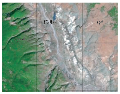 (1)裸露的残坡积层在遥感图像上一般呈较光滑致密结构, 颜色与基岩的色调相似, 如盐源盆地北部白乌镇西关下附近出露的残积影像色调与该地区发育的紫红色岩层的色调相似(图3)。