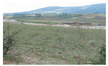 (2)盐源盆地内第四纪残坡积层表层土壤由中生界地层岩石风化后形成的紫红色、暗红色粘土夹少量碎石组成, 表层土壤厚度一般在0.2~8 m之间, 部分残坡积层分布区种有农作物, 此类残坡积层具有植物生长的较优越环境条件, 如盐源盆地的西北棉垭附近, 第四纪残坡积堆积物较厚, 地表出露的厚度约2 m(图7), 岩性为红色泥质粘土; 盐源盆地北部白乌镇西, 第四纪残积表层主要为荒草地, 岩性为红色泥质粘土为主, 部分地区被利用为耕地(图8)。