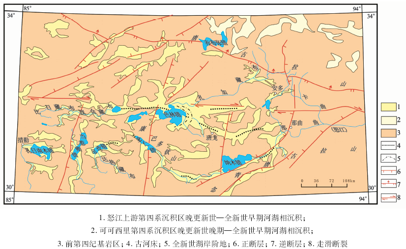 利用遥感技术结合实地验证性工作, 对研究区第四系进行调查研究的结果表明, 晚更新世时期羌南广大地区发育湖相沉积, 晚期受发生于晚更新世与全新世交替时期的“ 那曲运动” 影响, 湖泊高度萎缩, 出现所谓的“ 大湖期” , 同时怒江溯源侵蚀进入羌南, 现今的纳木错、色林错及其以南广大地区均属古怒江源区, 古分水岭处在当惹雍错一带, 比日藏布也应是古怒江上游主要水系之一。“ 那曲运动” 后期差异升降运动的加剧, 于那曲盆地中部形成近南北向断隆带, 成为怒江水系新的分水岭, 使羌南成为内陆盆地区, 现今位于青藏高原中南部的我国内、外流区分水岭基本形成, 即它是古怒江分水岭向东迁移约500 km的结果, 也是对“ 那曲运动” 最直接的响应。