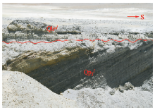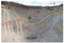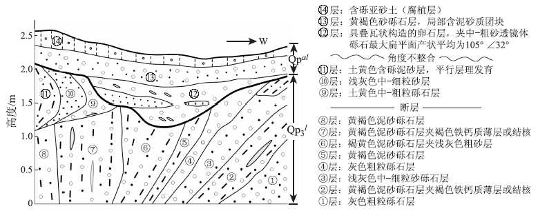 仅就地表而言, 可可西里区广泛分布着晚更新世晚期至全新世早期且以后者为主的湖相[19]冰水堆积, 厚度较小, 一般在数十米以内变化, 是该区高原面上的主要沉积物。在该沉积物之上或发育全新世中晚期的河流相、湖相沉积, 或在局部地区发育沼泽、冲洪积沉积物。怒江上游区以晚更新世至全新世早期且以前者为主的河湖相沉积, 下部存在早更新世湖相地层[18, 20]。但研究区内所出露的第四系绝大部分为上更新统上部地层, 在那曲南西方向约30 km处所揭露出的该层位剖面岩性主要为一套灰色、黄褐色、土黄色粗碎屑堆积层夹少量砂层以及泥钙质、铁质透镜体, 其上被全新统不整合覆盖(图3)。