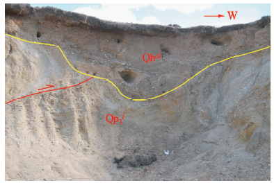 (1)“ 那曲运动” 使上更新统湖相地层发生强烈变形。在怒江上游那曲地区, 可以看到松散的上更新统地层发育轴面近于直立的背、向斜构造, 局部甚至出现倒转褶皱以及低角度逆掩断层(图6)。该套地层之上被全新统河流相地层不整合覆盖, 沿不整合面可以见到古河床侵蚀下切形成的凸凹不平的侵蚀面。这一现象不仅在怒江上游的那曲地区可以见到, 于藏南已属雅鲁藏布江流域的嘎拉地区同样存在。进一步调查发现, 上述不整合现象多发育于现今河流的分水岭一带, 河谷盆地内部的上更新统仍以近水平的稳定产状为主。这种现象说明, 差异隆升应是“ 那曲运动” 的主要运动形式, 在断隆地区(特别是在断隆的边部)易出现上更新统的强烈变形, 而在隆升幅度相对较小的断坳区, 则以整体被抬升的变形形式为主。