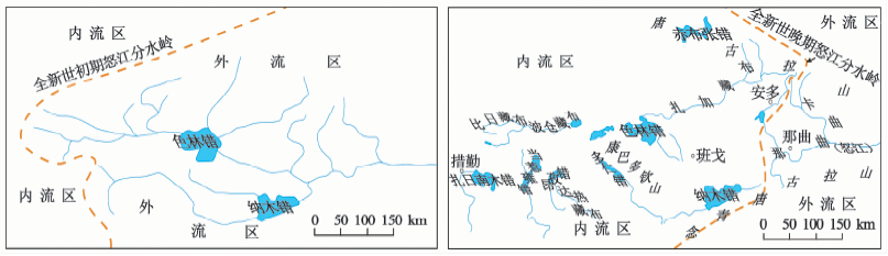 (3)“ 那曲运动” 持续活动至全新世早期, 差异性活动明显加剧, 近南北向或北东向垒、堑式构造成形, 特别是位于念青唐古拉— 那曲一带垒式断隆的形成阻断了古怒江主流, 造成大面积的羌南古怒江源区转变成内陆盆地, 分水岭大规模向东迁移至现今的位置。这种分水岭迁移并使外流区转变成内流区的现象并非仅怒江上游流域, 在青藏高原东北部黄河流域的共和盆地同样存在。共和盆地中部同样形成于“ 那曲运动” 的断隆带(将另文讨论)使原整个盆地均为外流盆地的盆地西半部成为内流区, 出现盆地东、西半部分属内、外流区的独特现象。