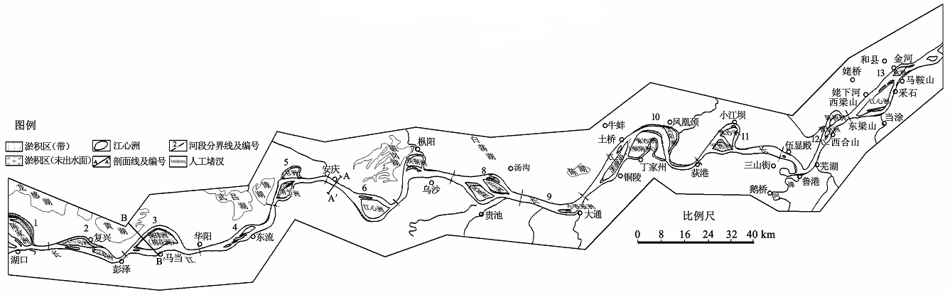 (12)三山河口— 东、西梁山(芜湖河段)。该河段上起三山河口下至东、西梁山, 全长43 km。淤积主要表现在繁昌县小洲至芜湖的澛港, 岸滩淤积不断向北扩展, 现宽度至少有1.5 km左右, 淤滩高程已高出平水期江水位约0.3~0.5 m左右。三山河口的江段内, 原鲫鱼虾洲在1986年消失后, 在其右缘下方现已淤长成一个新的潜洲, 高程已达3.9 m, 面积达3.5 km2, 洲尾有向下游淤长之势。其下游则在芜湖市北的曹姑洲, 受四福山回流影响, 在曹姑洲东侧已淤长了一处长约1 km、宽约500 m新沙洲。另外, 芜湖市的一些工程, 如长江大桥和火车轮渡码头, 对下游岸带也产生了一些窄条状的淤积带。