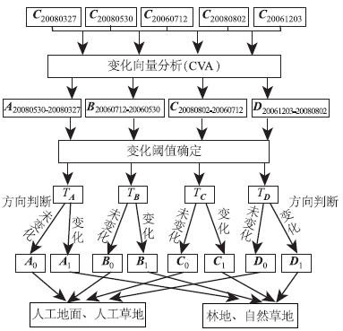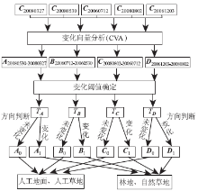 提取林地、草地、人工地面的技术流程如图1所示。图上, C20080327代表2008年3月27日TM图像经过SVM分类后得到的植被概率和非植被概率的结果图像数据, 同理于C20080530, C20060712, C20080802和C20061203; A20080530-20080327为2008年5月30日和2008年3月27日两景TM图像植被概率和非植被概率结果图像之间的变化强度图像, 同理于B20060712-20080530, C20080802-20060712, D20061203-20080802; TA, TB, TC, TD分别为最终确定的4景变化强度图像的变化阈值。