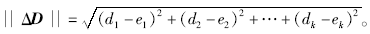 变化向量分析方法和分类后比较方法都是变化检测中的经典算法[7]。变化向量是描述从时相1到时相2变化的方向和大小的光谱变化向量, 假设时相1和时相2图像的像元灰度级矢量分别为D=(d1 , d2, d3 , …, dk), E=(e1 , e2, e3, …, ek), 则变化向量为