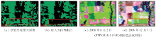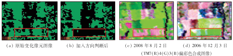 林地及自然草地在A20080530-20080327上变化方向是从枯黄植被或非植被到绿色植被, 而在D20061203-20080802上变化方向则是从植被到枯黄植被或非植被。利用两期图像的植被后验概率的差值可以体现变化方向, 将方向判断加入到提取的林地及自然草地结果中, 有助于林地及自然草地的提取。以D20061203-20080802为例, 提取林地及自然草地需要的规律为8月2日的绿色植被转成12月3日的枯黄植被或非植被, 而从图3中红框标出范围可以看出该处是从非植被(图3(c))转换成绿色植被(图3(d))的变化。这种变化显然与上述规律不符, 所提取的信息不是我们需要的林地及自然草地信息(图3(a))。加入方向判断后, 这一方向变化所显示的错误信息就被去除了(图3(b))。图3(a)与图3(b)中墨绿色为林地和自然草地分布区, 黑色为其他地物分布区; 图3(c)与图3(d)中绿色为绿色植被分布区。