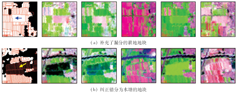 1)本文提出的耕地提取方法具有可行性, 提取出的耕地结果具有现势性和较高的准确性, 能够修正历史耕地矢量数据中的地块错分、漏分问题以达到更新。将该方法应用于北京市通州区的结果表明, 地物类型分类图的总体精度及Kappa系数分别为93.3%和91.0%, 均在90%以上, 其中, 耕地结果获得了87.3%的产品精度以及100%的用户精度。