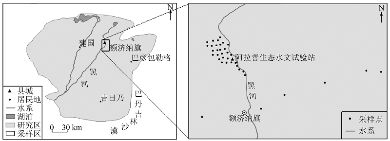 本文研究区额济纳盆地位于河西走廊黑河流域下游内蒙古额济纳旗(图1(左)), 介于E99° 00'~102° 00', N40° 10'~42° 30'之间, 为开阔平坦的盆地, 海拔高程为900~1 100 m, 地面坡降为1/1 000~1/1 200, 整体地形向东北倾斜。额济纳盆地地处亚洲大陆腹地, 夏季酷热、冬季严寒、降水稀少、蒸发强烈、温差大、风大沙多, 为典型的大陆性干旱气候。据额济纳旗气象站1957— 2006年资料, 多年平均降水量42 mm, 年降水量最大103 mm, 最小7 mm, 多年平均蒸发量3 755 mm, 最高达4 035 mm。多年平均气温8.3℃, 极端最高气温为42.2℃, 极端最低温度-37.6℃, 年日照时数3 396 h, 无霜期145 h, 气候干燥, 风沙灾害频发, 是严重的缺水区和生态脆弱区。土壤类型主要为盐化草甸土、潮土(灰色草甸土)、盐土和风沙土, 绝大多数为荒漠戈壁, 主要生长着以胡杨、沙枣和红柳为主的荒漠特有植被[5, 6, 7]。