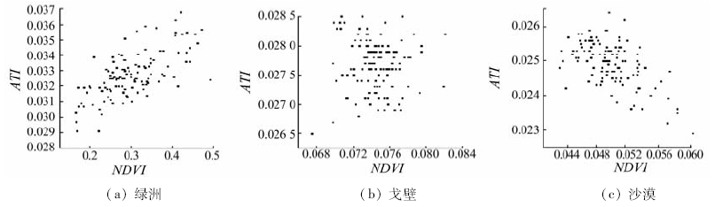 从图3可知, 绿洲区NDVI由0.2~0.45对应的ATI集中在0.03~0.035之间, 对应的表观热惯量较大, 而戈壁和沙漠的NDVI< 0.1, 对应的表观热惯量较小。从散点图上看, 绿洲区植被指数与表观热惯量之间相关性较好, 戈壁、沙漠植被指数与表观热惯量相关性较差。从表2中可知, 沙漠和戈壁NDVI均值都很小, 几乎没有植被覆盖, 对应的表观热惯量均值也很小, 而绿洲对应的表观热惯量较大。