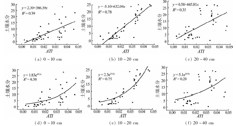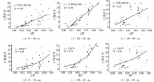 国内研究的热惯量法含水量模型种类多, 关于表观热惯量的经验公式也有许多不同形式, 其中常用的是线性模型和指数模型。本文对土壤表观热惯量与对应日期各层次的实测土壤水分进行一元线性和指数回归分析, 采用最小二乘法建立它们之间的回归方程, 如图4所示。