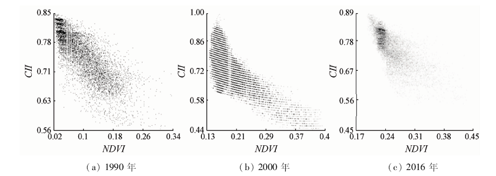 Fig.7 Oasis cold island effect and NDVI scatter plot in the study area |