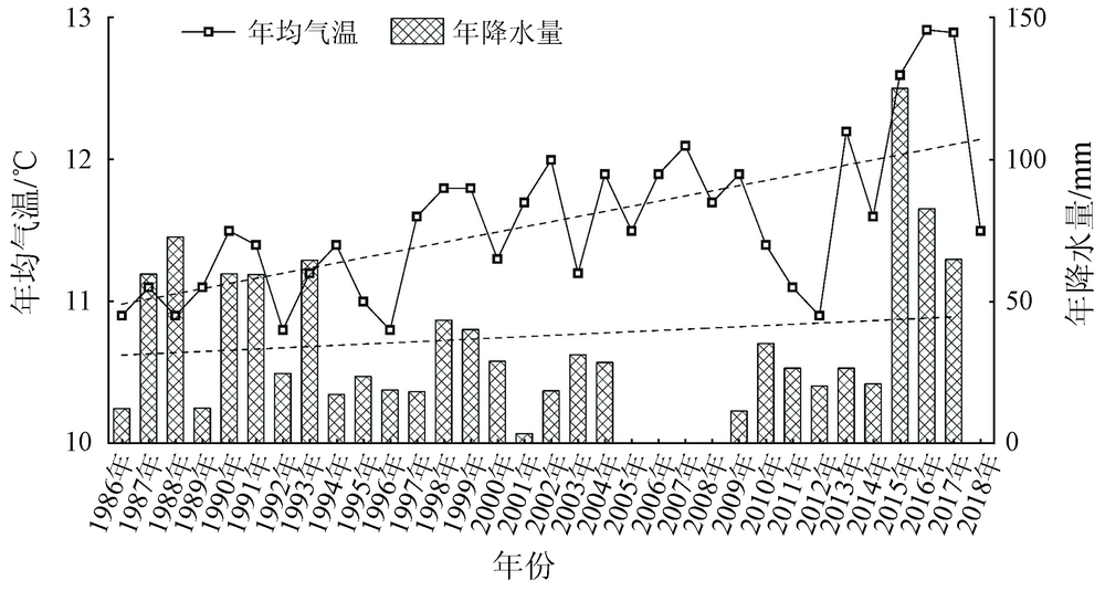 图5 研究区年平均气温和降水量变化 注: 2005、2006、2007、2008、2018年站点降水缺测 |