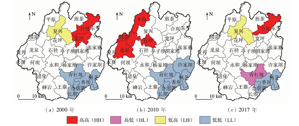 Fig.7 Eco-environmental quality LISA diagram in Liuchi River basin from 2000 to 2017 |