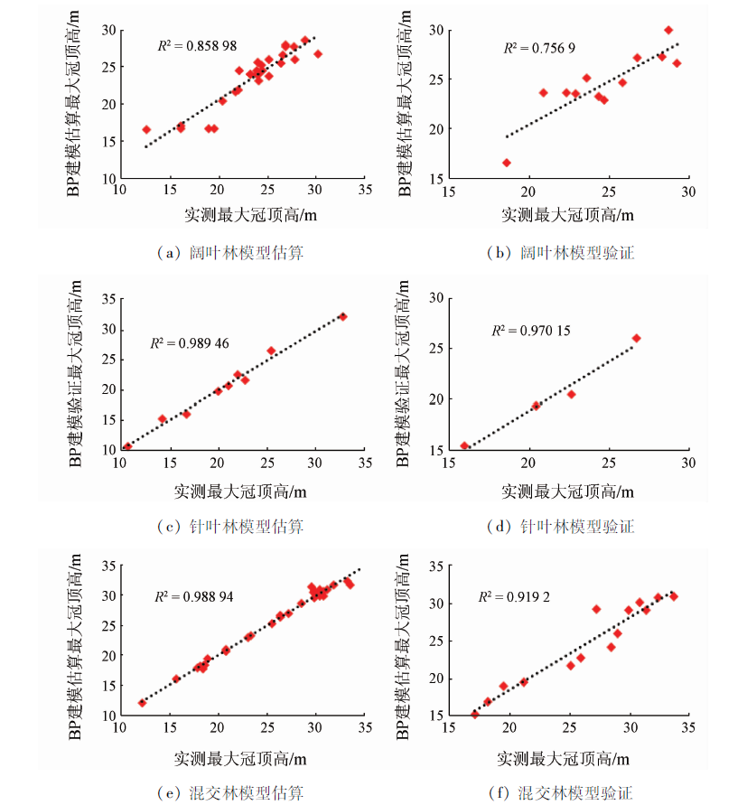 图3 不同林型BP神经网络模型冠顶高模拟及验证 |