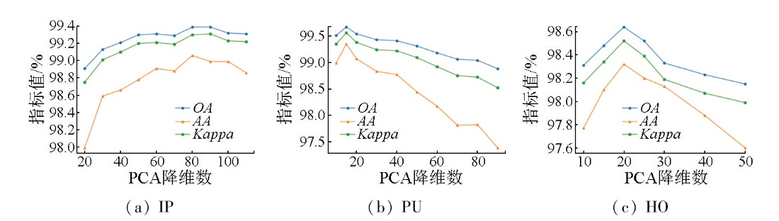 | 图9 3个数据集下不同PCA降维后特征数对分类精度影响图 |