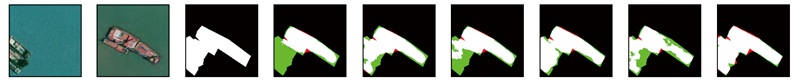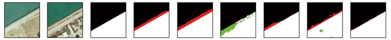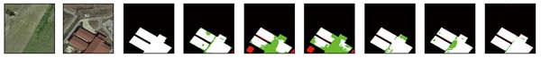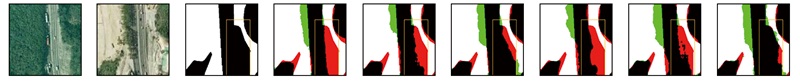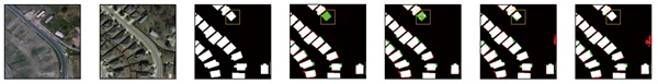 在表6的a中,对于有些海上轮船从有到无,有些海上轮船从无到有而产生的变化,除了FTUNet和BIT,其他方法都不能将其识别完整;与BIT相比,FTUNet识别出变化区域的边界更加准确。在表6的b中,对于道路扩建,可以看到除了FTUNet的识别结果较为完整,其他几个网络都有不同程度的漏检。在表6的c中,对于新建大型建筑物,虽然这6个网络都不能将建筑物完整的识别出来,但FTUNet识别的结果完整度是最高的,漏检最少。表6前3行显示了3种不同类型的变化,FTUNet都能比较完整地识别出变化区域。在表6的d和e中,对于道路扩建和新增小建筑物,在FTUNet识别出变化区域的边界更加准确,特别在表6的d中表现最明显,FTUNet能完整的识别出,但其他网络在变化区域边界处存在不同程度的误检或漏检。