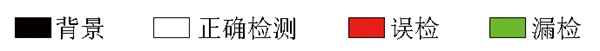 变化检测性能通过4个典型指标来评估[11]:精确率(precision,P)、召回率(recall,R)、交并比(intersection over union,IoU)和F1分数。P越高表示错误检测越少;R更大表明更多的正样本被检测出来;IoU和F1分数都是对预测结果进行整体度量,值越大,预测结果就越好。指标公式分别为: