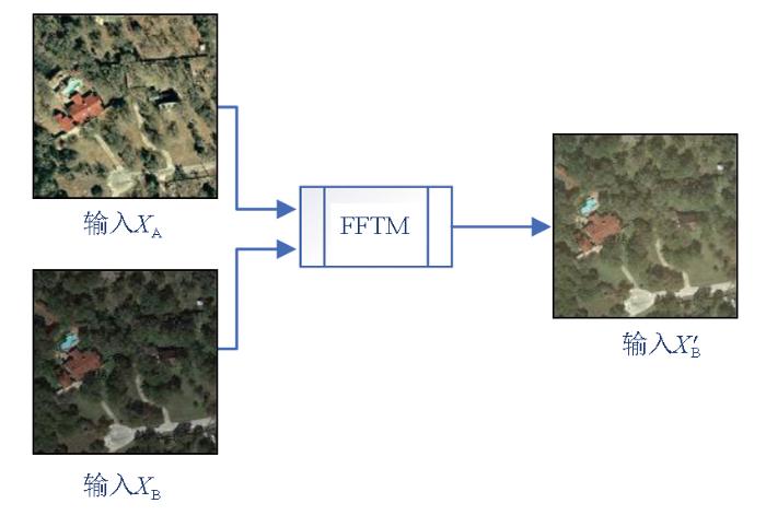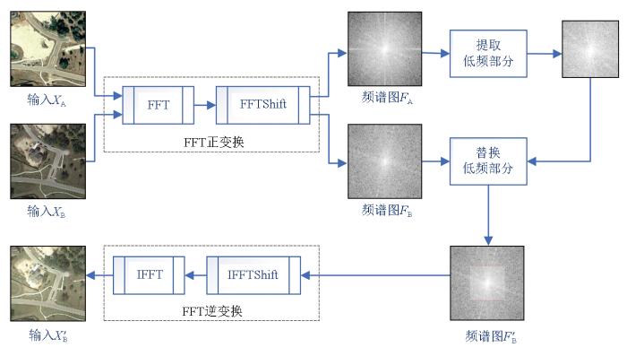 FFTM的基本原理如图2所示。对于输入图像XA和XB,以图像XA为参考。首先,将2张图像分别通过FFT正变换从空间域转换到频率域,通过FFT后图像频谱图低频部分在四周,高频部分在中间,因此再通过FFTShift将低频部分平移到频谱图中心;然后,将XB的低频部分替换为XA的低频部分;最后,将FFT变换原点平移回原位置,并采用FFT逆变换(inverse FFT,IFFT)将XB从频率域转换回空间域,得到统一风格后的图像X'B。