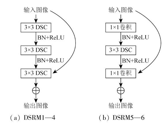 SD-BASNet的深度监督Encoder-Decoder结构由编码层、解码层和桥接层构成。编码部分由1个卷积层和6个DSRM构成。如图3所示,DSRM1—4由64个大小为3×3、步长为1的卷积核组成,用3×3的DSC替换3×3的普通卷积,并进行BN和ReLU操作,该部分使得网络在训练阶段可提取影像特征,捕捉影像中不同像素之间的上下文信息;而DSRM5—6由3个基础残差块和512个卷积核组成,使用DSC代替其中的普通卷积,以减少网络整体参数量。桥接层由3个残差块组成,每个残差块由512个大小为3×3的DSC,BN正则化和ReLU激活函数构成,目的是进一步获取影像特征信息。解码层和编码层几乎对称,不同之处在于卷积核中为普通的3×3卷积。解码层在上采样中通过双线性插值可以有效地增加特征图的分辨率,同时节约内存、减少网络计算资源;最后经过sigmoid函数将7种不同分辨率的特征图(Sup1—7)输出。此外,编解码层之间通过连接操作将高级与低级特征连接起来,利于语义和细节信息的结合,减少信息丢失。