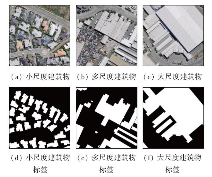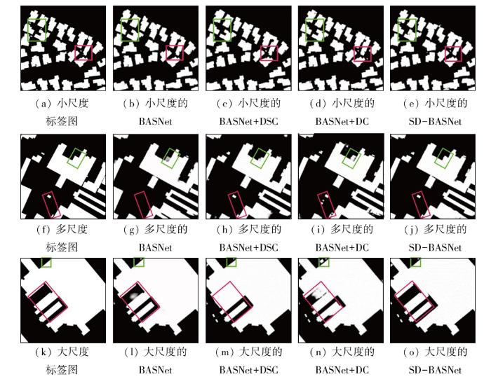 为分析SD-BASNet在WHU建筑物数据集中不同场景下的性能差异,在测试集中选取小尺度、多尺度、大尺度建筑物用于定性定量分析。选取的预测场景影像及标签示例如图5所示。以下分为小尺度、多尺度、大尺度3个场景分析各个网络测试性能差异的原因。