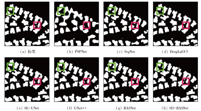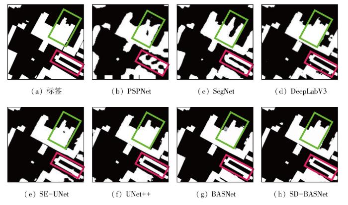 2)多尺度建筑物提取。表4和图7分别展示了多尺度建筑物场景下的检测结果和提取情况。从表4可以看出,SD-BASNet总体领先于其他的对比网络,尤其在mPA精度指标方面达到了94.50%。从图7多尺度建筑物中可以明显看出建筑物的边缘提取方面,SD-BASNet具有明显优势。PSPNet与SegNet可视化结果最差,边界信息出现严重的不连续性缺陷现象;而DeepLabV3,SE-UNet和UNet++在一定程度上弥补了边缘提取缺陷问题。从标注的红绿框可知,相较于前几种网络,BASNet更注重边缘信息和语义特征的获取,从而提取结果较为精确。SD-BASNet相较于BASNet而言,不仅在参数量上有所下降,且更聚焦于特征信息之间的提取。从绿框看,比之BASNet提取建筑物出现语义信息表征弱的情况,SD-BASNet提取建筑物更为优越。
