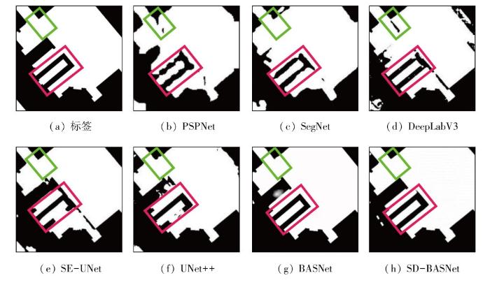 为了检验SD-BASNet的建筑物提取效果,本文选取语义分割经典网络PSPNet[26],SegNet[27],Deep-LabV3[28],SE-UNet[29]和UNet++[30]进行实验,并增加了基础网络BASNet与SD-BASNet进行对比,在WHU建筑物数据集上进行性能测试,得出各项精度评价指标如表2所示。从表中可以看出,与其他方法相比,本文所提网络在mIoU,mPA,召回率,精确率和F1方面分别最大提升了25.10%,16.73%,7.13%,32.98%和20.21%,仅一项数据较低,即SD-BASNet网络的召回率方面低于基础网络BASNet,但在其余指标上是最优的。且提出网络侧重于降低网络参数量,从表1可看出参数量的有效下降,证实了本文所提网络SD-BASNet的可行性。