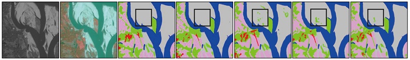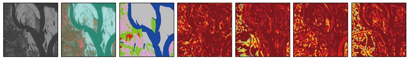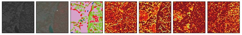 | 样本编号 | PAN影像 | MS影像 | 标签 | 网络对耕地类别的关注度 | 网络对植被类别的关注度 | ||
