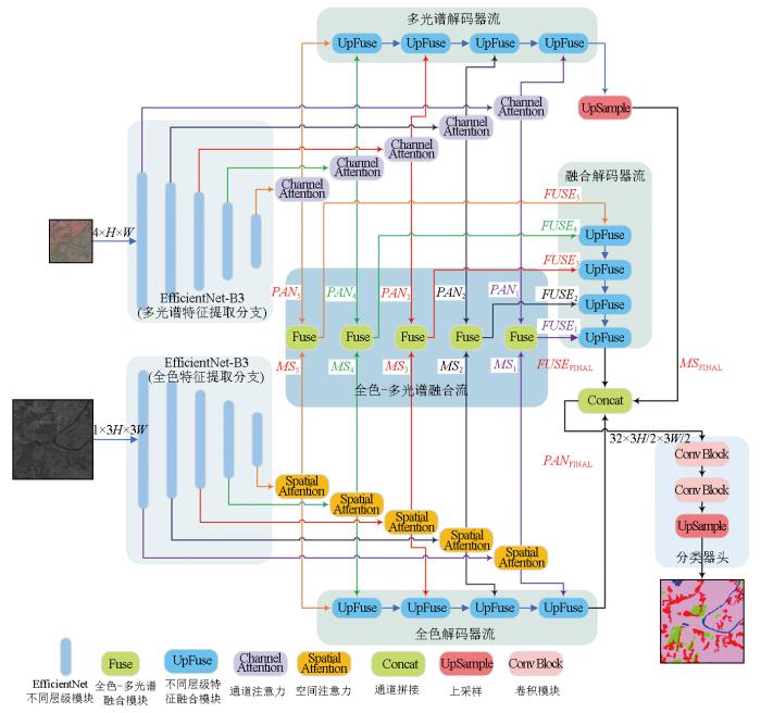 综合考虑模型规模和特征语义,采用EfficientNet-B3为特征提取网络,并考虑到PAN与MS影像的空间分辨率差异,设计尺寸适配的感受野和卷积权重尺寸。