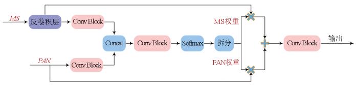 在图3中,先利用反卷积层将多光谱特征图上采样到和全色特征图维度相同的大小,记此时的全色特征图为FPAN、多光谱特征图为FMS,二者维度均为B×C×H0×W0。接着利用卷积将二者通道数降维至原始通道数的1/4,并将在通道维度上进行合并。合并后的特征图随后通过一层卷积得到B×2×H0×W0的特征图Fweight,利用Softmax操作将其在通道维度上进行归一化,最终得到特征图和多光谱特征图的权重(WPAN和WMS),公式分别为: