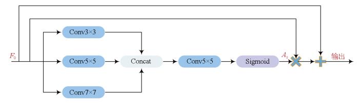 空间注意力通过学习空间位置上的权重分配来强调空间位置的重要性,以更有效地捕捉地物内部细节、地物边缘等空间信息,详细流程如图4所示。对于输入维度为C×H0×W0的特征图F0,传统的空间注意力机制采用全局池化的方式进行通道降维,这种方式尽管轻便但无可学习参数,不利于发挥深度学习的优势。为增强对尺度变化的鲁棒性,本模块使用3个不同卷积核的卷积层进行降维,并在通道维度拼接后,再经卷积和Sigmoid激活生成最终的空间注意力AS。上述流程用公式可以表示为: