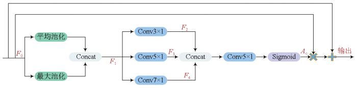 通道注意力机制关注通道之间的相互关系,并分配不同权重,流程如图5所示。由于输入图像的尺寸不定,为了避免增加额外的计算量,所以对于输入维度为C×H×W的特征图F0,先进行全局平均池化和全局最大池化,得到2个C×1×1特征图,再合并后两个维度并转置为1×C的特征图;接着,将二者拼接为2×C的F1以充分利用交互信息;然后,对F1应用3个卷积核大小不同的一维卷积得到F2,F3和F4并进行合并,从而融合通道维度不同感受野的信息;最后,通过一维卷积和Sigmoid激活生成通道注意力AC。上述流程用公式表示为: