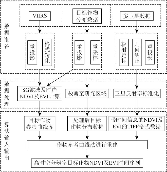 本研究主要技术路线如图2所示。首先准备了VIIRS数据、目标作物分布数据以及多种卫星反射率数据,在对数据进行必要的预处理后,对经过预处理的GF-1,GF-6,Sentinel-2数据进行反射率标准化工作。在对GF卫星以及Sentinel-2卫星进行预处理时,本文采用ENVI中的PRC Orthorectification Workflow模块进行正射纠正,为达到更好的纠正效果,在进行处理时将GF及Sentinel-2卫星的分辨率重采样至15 m;然后进行目标作物的NDVI及EVI时间序列重建,首先制作经过SG滤波的NDVI及EVI时间序列参考曲线数据库,得到研究区域的NDVI及EVI参考曲线数据库;接着对多卫星反射率数据进行NDVI及EVI的计算,同时记录对应的时间信息用于作物参考曲线法的植被指数时间序列重建;再使用研究区域的目标作物分布数据对数据进行目标作物像元的筛选及判断;最后输入至作物参考曲线法重建代码中完成研究区域内冬小麦的NDVI及EVI时间序列的重建。