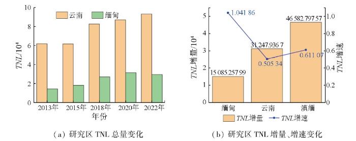 在研究滇缅TNL的基础上,本文还进一步分析了夜光增值与夜光增速,分别计算2013—2022年TNL的增量和增速。计算公式为:
