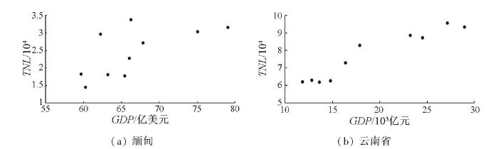 1)滇缅地区夜间灯光总值与 GDP 数据间呈高度正相关,将 TNL 作为 GDP 的代理变量具有科学性与合理性。