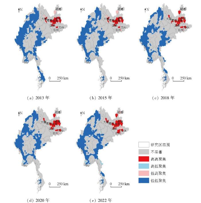 高高聚集区域主要分布在云南省昆明市及周边地区,据云南省统计年鉴,2013年昆明市GDP为3 415.31亿元,到2022年增长至4 126.06亿元,增长量位于全省第一,作为国家重点培育的城市群之一,昆明市起到良好的辐射作用,带动了周边城市的发展,可以看出10 a间昆明市周边地区保持着高高聚集现象,且与周边城市形成高值与高值相邻的地理聚集带;云南省昭通市南部在2015年的低高型聚集区在2018年转变成高高聚集区,近年来昭通市大力推动工业发展与重点项目建设,经济得以快速发展;红河市在2022年GDP为2 863.08亿元,10 a间经济增长量位于全省第三,农业与旅游业都在带动经济增长,与红河市相邻地区的文山市在2015年也有少量高高聚集区域,体现出辐射作用。作为东南亚重要的国家之一,与我国云南省紧密相连的缅甸,是最不发达的国家之一,由于国内战争频繁发生,再加上一些国家的经济制裁,使得国内经济与社会活动受到严重冲击,导致农业生产停滞,工业产出下降,进出口贸易减少,本国货币大幅贬值,外资纷纷撤离,国内经济陷入混乱和无序状态,在全球疫情肆虐和经济动荡叠加的背景下,更加减缓了缅甸的经济发展[21 ] 。使得缅甸大部分区域的TNL呈现出低低聚集区的空间分布特征。