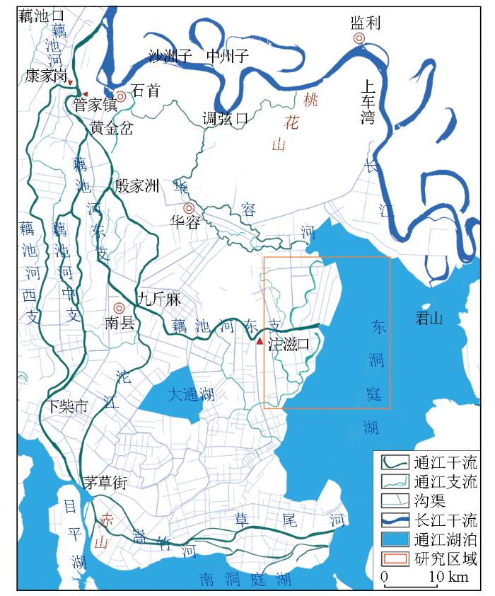 ... 洞庭湖注滋口三角洲位于藕池河东支入湖河口.藕池河与松滋河、虎渡河、调弦河合称“荆江南流四河”,是沟通长江与洞庭湖的水沙通道,也是连接江湖关系的重要纽带.1852年,长江大水冲决荆江的新厂—石首段,1860年、1870年长江两次大洪水在原溃口处冲击形成藕池河.藕池河自藕池口南下经康家岗和管家铺,其下按分合关系分为东支、中支、西支3条支流(图1 ),各支流互相交织,彼此穿插,呈典型的辫状水系,流域面积3 818.60 km2 [18 ] ,1950—2023年间平均径流量309.88×108 m3 ,占荆江向南分流总径流量的36.88%.其中,藕池河东支全长143 km,多年平均径流量286.24 ×108 m3 [24 ] . ...