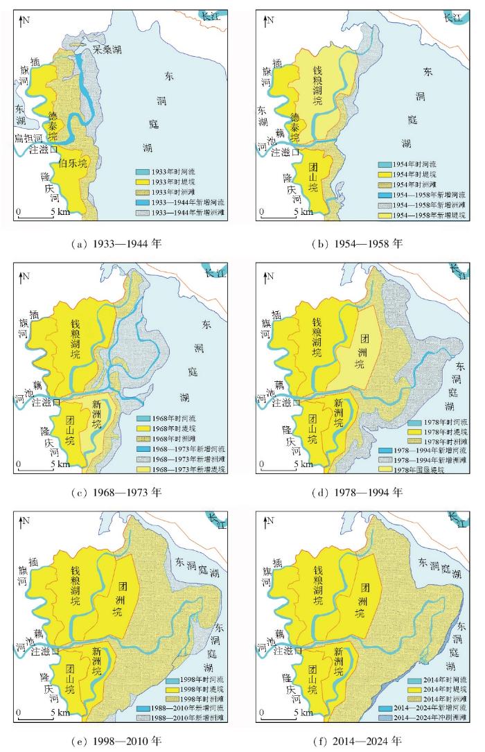 ... 河流入湖处泥沙淤积由河口向湖心发展.藕池河东支位于东洞庭湖西部,是长江“四口”输沙量最大的河流,1956年以来年均输沙量3 920×104 t,占同期入湖泥沙总量的34.34%,为注滋口三角洲提供了充分的物质来源[24 ] .1933—2024年间,藕池河东支河口地带“沧海桑田”,空间上表现为注滋口三角洲不断向湖域推进,淤积的高位洲滩被围垦形成堤垸,老的河道废弃为垸内“哑河型内湖”,新的河道不断向湖域延伸并多次改道(图3 ). ...