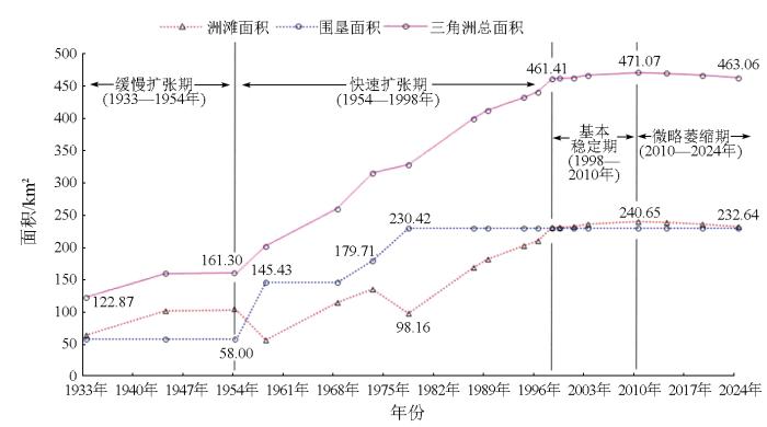 2)1954—1998年的快速扩张期。为持续时间最长、扩张速率最大的发展阶段,三角洲总面积由161.30 km2 增加到461.41 km2 ,扩大了300.11 km2 ,扩张速率为2.61~11.14 km2 /a,年均6.82 km2 /a,是1933—2024年间年均扩张速率(3.74 km2 /a)的1.82倍。其中,1954—1958年、1968—1973年以及1996—1998年3个时段的扩张速率最大,分别达到10.05 km2 /a,11.14 km2 /a和10.24 km2 /a。这与1954年、1969年、1998年洞庭湖区发生特大洪涝灾害的时间吻合[27 ] 。1958—1978年间,在“以粮为纲”的农业发展背景下,湖区掀起了 “向湖泊进军,向水面要粮”热潮,注滋口三角洲先后围挽了3个大型堤垸,分别是1958年围垦的钱粮湖垸,面积87.43 km2 ;1971年围垦的新洲垸,面积34.28 km2 ;1978年围垦的团洲垸,面积50.71 km2 。本阶段,我国先后经历了“大炼钢铁”“向荒山要粮”等群众运动,森林滥伐,水土流失加剧,致使大量泥沙被地表水搬运并沉积于河口,这是本阶段三角洲快速扩张的主要驱动。