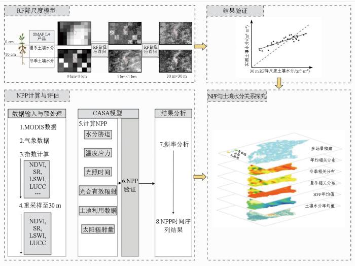 如图2 所示,本研究通过RF模型,将NDVI和LST作为解释变量,将2019—2023年夏、冬2季SMAP L4产品降尺度,获得1 km和30 m级分辨率的土壤水分数据。利用增加LSWI指数修正CASA模型,量化分析夏、冬季NPP。构建不同土地利用类型,评估土壤水分时空演变对NPP的影响。
