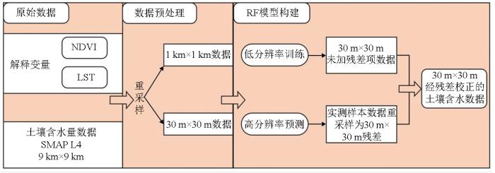 1)将空间分辨率1 km级的LST和500 m级的NDVI解释变量重采样至30 m级,同时将500 m级的NDVI重采样至1 km级。使用RF算法将1 km级的LST和NDVI 2个解释变量数据集与SMAP L4产品之间建立映射关系,并将此关系应用于30 m解释变量数据集获得降尺度后的SMAP L4结果(空间分辨率为30 m)。