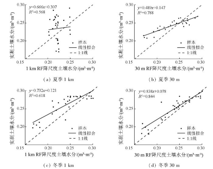 本研究对比2023年夏季、冬季的实测土壤含水数据与RF自适应回归降尺度结果,表明经RF降尺度的土壤水分含量与实际采集的数据能较好吻合,且随着分辨率升高,其R 2 有所增加。从散点图(图5 )的分布趋势看来,RF模型降尺度结果与实测数据相关性良好,不过夏季降尺度结果的R 2 和离散程度稍微不及冬季降尺度结果,表明在夏季RF模型对于捕捉土壤水分与NDVI和LST等解释变量并进行降尺度预测的效果不理想。整体的RF降尺度结果对于实测数据都偏向高估的现象,并且呈现出不能有效表征极大、极小值的情况。图5(a) 降尺度结果仅反映0.20~0.25区间的数值分布,虽然图5(b)—(d) 反映了0.16~0.31区间内的土壤水分分布,但是表征极大值中存在低估于实测数据的情况。