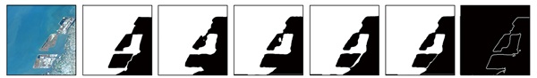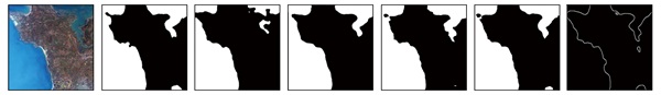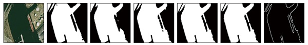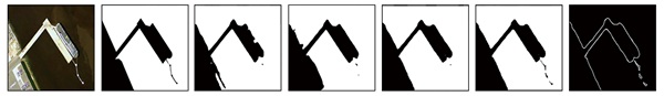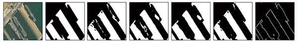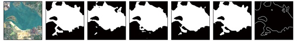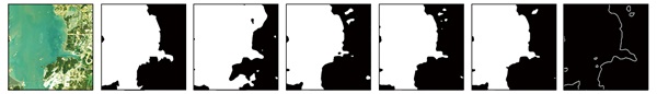 ... 采用Coastline-Segmentation[30 ] 和HRSC2016[31 ] 2个数据集进行实验.Coastline-Segmentation是专门用于海陆分割的标准数据集,选择中国近海海岸带作为研究区,使用了来自不同年份和不同海岸线的Landsat8 OLI光学遥感图像;HRSC2016数据集信息量和复杂度更高,其中包含了各类海域和港口的图像,涵盖了不同类型和尺寸的船舶(被分类在陆地区域内),且每幅图像都伴有一个人工标记的真实标签值.这2个数据集的部分样本图像分别如图7 和图8 所示,其中,黑色代表陆地,白色代表海洋. ...