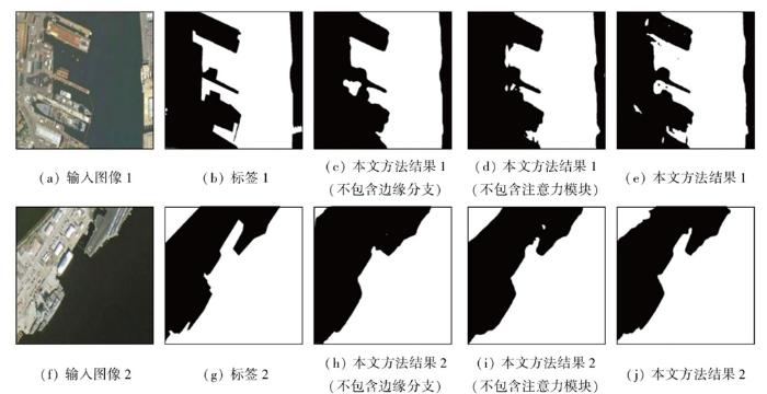 本文进行了消融实验以进一步证明本文提出的边缘部分和注意力模块的有效性。在具有更加复杂的海陆边界细节的HRSC2016数据集上分别测试了包含边缘分支的网络(即本文提出的方法)与不包含边缘分支的网络,以及包含注意力模块的网络(即本文提出的方法)与不包含注意力模块的网络。消融实验结果如图9 所示。在包含注意力模块的网络中,复杂内陆地区的分割效果得到显著改善。增加边缘提取分支后,网络在海陆边界的判别准确率得到很大程度改善,边缘区域的分类精度也得到明显提高。在各项量化测试指标方面,未包含边缘分支网络和本文网络的交并比分别为92.21%和93.14%;正确率分别为95.57%和96.09%;召回率分别为94.65%和95.26%。未包含注意力模块网络和本文网络的交并比分别为91.86%和93.14%;正确率分别为95.23%和96.09%;召回率分别为93.67%和95.26%。从这些结果可见,本文提出的包含边缘分支和注意力模块的模型具有较为优越的性能,更能满足实际海陆分割的需求。