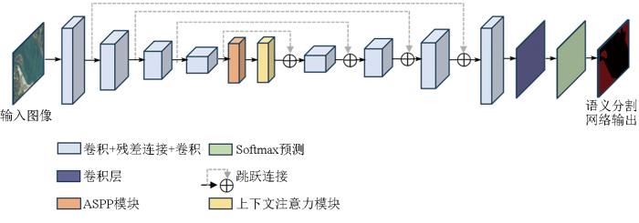 ... 语义分割模块结构如图2 所示.该模块主要以FusionNet[20 ] 作为基本结构,网络中的残差结构[21 ] 可增强网络深层学习能力,从而提高特征提取性能,实现更加精细的海陆分割.在FusionNet网络对称结构的基础上,引入ASPP模块以及一个上下文注意力模块,进而构建海陆分割的语义分割网络模块.相比于传统的FusionNet网络结构,首先,利用改进的ASPP和长短跳跃连接捕捉多尺度和多层次的上下文信息;然后利用一个上下文注意力模块来显式地学习不同上下文特征的权重,并基于这些权重融合不同尺度和层次的特征,从而提升上下文信息的准确性.具体而言,先是采用FusionNet网络下采样部分获取输入图像基本特征,然后使用优化后的ASPP模块替换原FusionNet网络中的Bridge层,并使用跳跃链接连接前后2层,扩大每次下采样的接受场,使U形底部的深层语义信息足以包含更多的图像信息,最后将ASPP模块的输出输入到上下文注意力模块.上下文注意力模块采用卷积注意力模块(convolutional block attention module,CBAM)[22 ] 进行融合,将得到的上下文聚合特征随后通过上采样模块来恢复特征图的原始尺寸,并进行像素级分类.此后,将这些特征在融合模块中与边缘提取分支生成的边缘特征进一步整合,以获得海陆分割的最终结果. ...