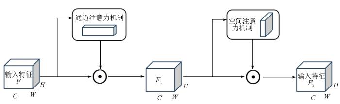 上下文信息在语义分割中扮演着关键角色,适当利用这些信息能显著提升分割精度[18 ] 。卷积操作虽然能够有效地增强特征提取能力,但其本身并不能感知特征的重要性。这就需要引入注意力机制[23 ] 来进行特征加权,模拟人类感知过程,从数据中自动识别和提取关键信息。目前,已有方法中在感知效果上表现出色的是CBAM,其能在通道和空间双注意力机制下对特征进行选择性增强。CBAM的总体过程如下:给定中间特征图F ∈RC × H × W (C 为通道数,表示特征的深度;H 为特征图的高度;W 为特征图的宽度)作为输入,利用通道注意力模块生成一维通道注意图M c ∈RC ×1×1 ,利用空间注意力模块生成二维空间注意力权值图M s ∈R1× H × W 。如图4 所示,F 1 和F 2 分别是经过通道注意力机制和空间注意力机制优化后得到的特征图,其操作过程公式为: