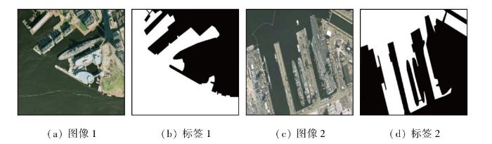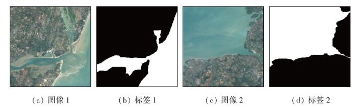 采用Coastline-Segmentation[30 ] 和HRSC2016[31 ] 2个数据集进行实验。Coastline-Segmentation是专门用于海陆分割的标准数据集,选择中国近海海岸带作为研究区,使用了来自不同年份和不同海岸线的Landsat8 OLI光学遥感图像;HRSC2016数据集信息量和复杂度更高,其中包含了各类海域和港口的图像,涵盖了不同类型和尺寸的船舶(被分类在陆地区域内),且每幅图像都伴有一个人工标记的真实标签值。这2个数据集的部分样本图像分别如图7 和图8 所示,其中,黑色代表陆地,白色代表海洋。