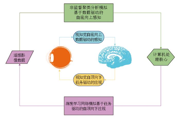 参考视觉自底向上感知与自顶向下观察的双驱动认知机制,本文提出了一种自适应的分割思路,采用非监督聚类分析模拟基于数据驱动的自底向上感知,通过深度学习网络模拟基于任务驱动的自顶向下注视,从而对高分辨率遥感影像实施智能化自适应的解读,如图1所示。