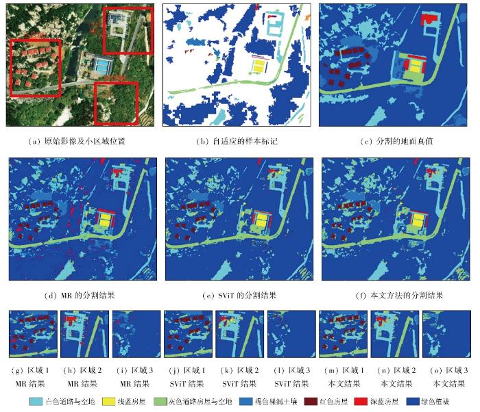 选择地物类型多样,房屋建筑、道路和多种植被混合的复杂地区为实验一场景,同时该区域影像明亮,光照强度大。在该区域中,选取了3个典型地物作为小区域:独栋小房屋、道路岔口以及顶面结构复杂的较大型房屋。按照上述方法得到实验结果,实验整体和小区域的分割精度见表1,分割结果如图11所示。该实验场景地物细节丰富,光照强度大,在此基础上,参考地面真值,对于自适应得到的地物样本,3种方法都能对地物进行较好的认知。但MR方法容易受到地物细节干扰,导致该方法在辨识地物的过程中带入了大量椒盐噪声。而SViT则展现出更强的认知性能,但由于光照的干扰与样本数量的限制,导致该方法将一些光照过强的房屋误认为地面道路与空地。对比之下,本文方法不但可以充分辨识不同光照条件下的房屋,而且可以对地物细节噪声进行很好的抵抗,得到了最佳的分割效果与分割精度。